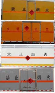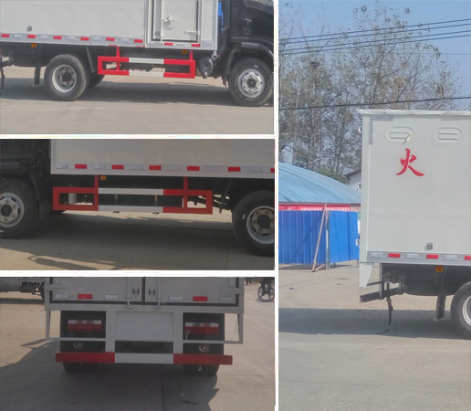 | 其他 | 该车适用于运输危险品为危险物品厢式运输车。选装同系列排半驾驶室和导流罩.厢体顶部封闭,不可开启,选装厢体内部结构。运送爆炸品的品名:黑火药,压缩黑火药,电(非电)引爆雷管,爆破炸药,导爆索,点燃导火索.烟花爆竹,运送爆炸品的项号:1.1D,1.1D,1.1B,1.1D,1.4G.1.4G.当整车长度为6960mm时,轴距4100mm、3800mm与后悬1660mm、1960mm一一对应.当整车长度为5995mm时,轴距3300mm与后悬1495mm对应.侧防护、后防护与车辆均采用焊接连接,材料均为:Q23,后防护断面尺寸(mm):120×50, 离地高度:390 mm.发动机ISF3.8s5154,YNF40E2,WP3Q130E50,D25TCIE3分别对应的油耗值为:18.29,18.03,18.20,18.3。仅采用底盘子午线轮胎和带ABS的底盘,该车前轮安装盘式制动器,前置排气管,装配限速装置,限速79km/h。安装带有卫星定位功能的行驶记录仪。ABS系统生产厂家:西安正昌电子有限责任公司,型号:ZQFB-V.选装侧门型式及位置. | ||