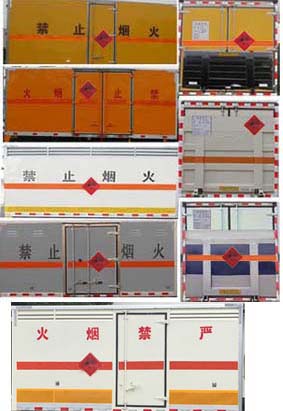 | 其他 | 随底盘选装驾驶室。该车适用于运输危险品。厢体顶部封闭,不可开启。该车用于运输具有独立容器包装的介质:黑火药,炸药,电引爆雷管,爆破炸药,烟花爆竹等,类项号:1.1B,1.1D,1.1G,1.2G,1.3G,1.4G等。防护材料:Q23碳钢,连接方式:左右侧面及后下部防护均采用焊接连接,后部防护断面尺寸(mm):100×50,后部防护离地高度(mm):420。仅采用底盘子午线轮胎和带ABS的底盘,该车前轮安装盘式制动器,前置排气管,装配限速装置,限速80km/h。安装带有卫星定位功能的行驶记录仪。ABS系统型号:APG3550500A,ABS系统生产厂家:浙江亚太机电股份有限公司。油耗对应关系(L/100km):13.0(JX493ZLQ5)。随底盘选装驾驶室。可选装侧门型式及位置,选装后部液压尾板;厢体颜色可变化,文字喷涂位置可变化。可选装不开侧门时,整车宽为1950mm。后部液压尾板收起状态长度是250mm。危险货物运输车辆的类型(EX/Ⅱ型车辆型车辆)。 | ||