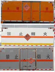 | 其他 | 该车适用于运输危险品。危险货物运输车辆的类型为EX/Ⅲ。厢体顶部封闭,不可开启。选装右侧箱体不开门,选装侧门型式及位置,选装厢体内部结构,随底盘选装驾驶室。整车长/轴距/后悬对应关系为(mm):5995/3280/1555,5995/3160/1675。仅采用底盘子午线轮胎和带ABS的底盘,该车前轮安装盘式制动器,前置排气管,装配限速装置,限速79km/h。安装带有卫星定位功能的行驶记录仪。安全装置为导静电带,用于防止静电。该车主要用于运输独立容器包装的介质:黑火药,压缩黑火药,电引爆雷管,爆破炸药,点燃导火索,硝胺炸药,专用烟火制品。运输介质类项号:1.1D,1.1D,1.1B,1.1D,1.4G,1.1D。侧防护和后防护装置材料材质为Q23碳钢,侧防护与箱体底部焊接连接,后防护装置与车架采用焊接连接。后防护截面尺寸(mm):100×50,离地高度为500mm。采用发动机型号YN27CRE1,YN38CRE1,CY4BK151,JE493ZLQ5,D25TCIE1,D25TCIE3对应油耗值分别为油耗 (L/100km):11.2,11.6,12.0,11.4,12.0,12.0。ABS系统型号为XH-KQ4S4M-E01,生产企业为广州市西合汽车电子装备有限公司。 | ||