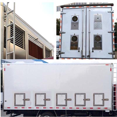 | 其他 | 该车用于运输雏禽,车辆顶部封闭不可开启.尾门为液压翻转上下坡道结构(收起状态水平长度为110mm,不计算在整车长度内).选装通风孔和天窗,侧板选装各种形式自然进风窗户,前板开有通风进口,选装各种型号的压缩机组、水帘等降温设施,尾门可选装封闭式电子排风扇.侧后防护材料均为Q23碳钢,侧防护与货箱横梁采用焊接连接,后防护与车架采用焊接连接.后部防护装置截面尺寸(mm):100×50,后防护离地的高500mm.发动机与油耗值对应关系(L/100km):YC4EG170-50/26.0, YC4EG185-50/26.3,ISB180 50/27.8,ISB210 50/26.5,ISD160 50/26.3.ABS型号: J ABS,生产厂家: 焦作博瑞克控制技术有限公司,安装具有卫星定位功能的行驶记录仪.该车仅采用轴距(mm)5200.随底盘选装驾驶室. | ||
