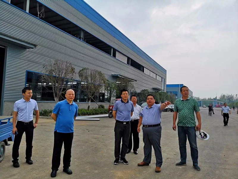 在程力集团总经理程阿罗(右二)、副总经朱武(右一)的陪同下,左永祥**(左三)一行参观了曾都高新区程力商用车工业园生产基地。