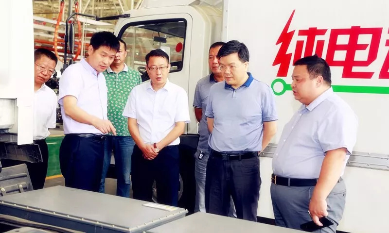 左永祥**(右二)对程力专用车作了了解,特别是对程力新能源车产生了浓厚的兴趣,提议加强鄂渝 略对接,把新能源底盘多层次运用在专用车领域,重点放在城市市政环卫、冷链及物流车的开发和生产。