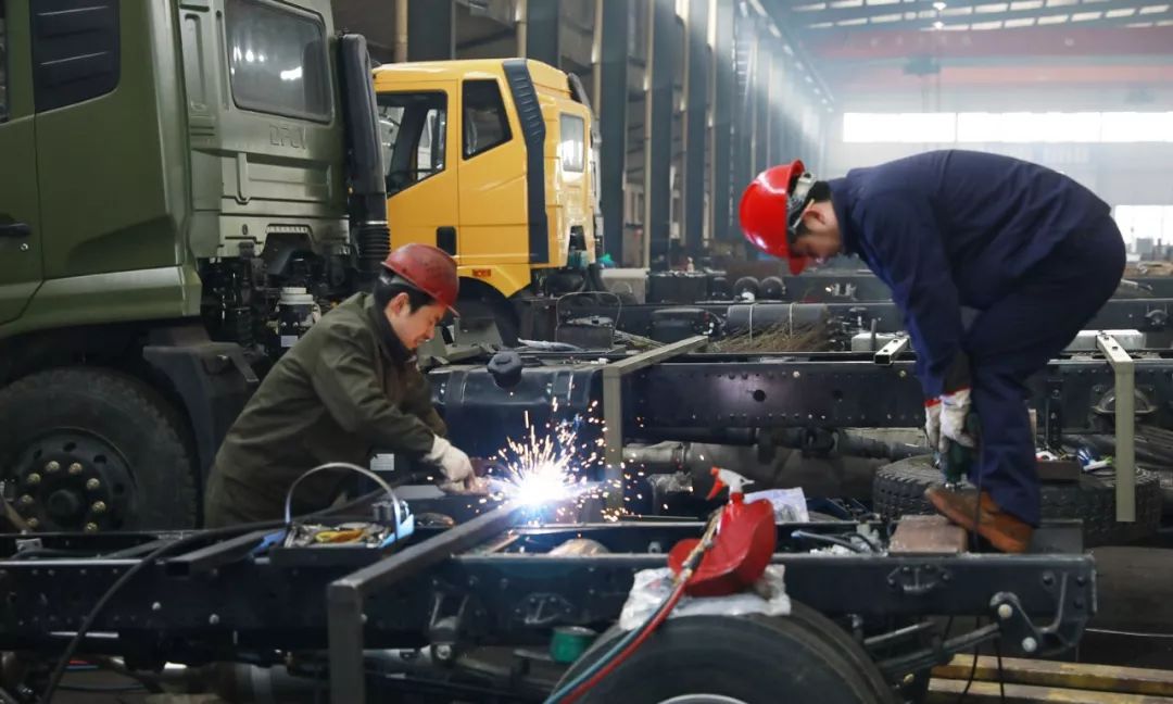 清晨,程力底盘生产线车间工人正忙碌排产,生产现场弧光闪闪,作业线上机车嘶鸣。