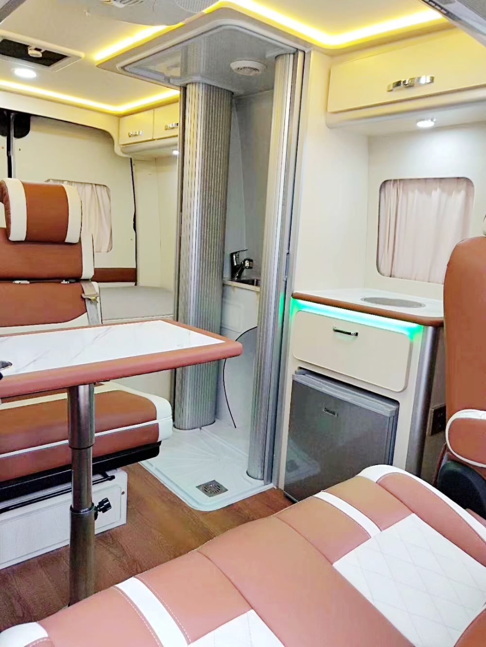 上汽大通V80短轴中顶B型房车内部软包裹设计,浅色系的家具与皮质包裹的座椅让房车的商务风更加浓厚。车厢从前到后的布局依次是会客区、厨房、卫生间和横床,此款上汽大通V80短轴中顶B型房车设施配置齐全、基础生活功能设计完善。会客区的多功能餐桌可拆卸,副驾驶的皮质座椅可向后翻转围坐,也可与后排座椅组成临时休息的拼床。