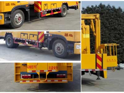 | 其他 | 1.该车前伸为850mm,整车长(mm)/高(mm)/轴距(mm)/ 后悬(mm)/后伸(mm)的对应关系为:10100/3800/4500/2660/860;9200/3700/3950/2470/700。2. 该车作业高度为22米,上装选装三节工作臂时作业高度为20m。3.防护材料:Q23碳钢,连接方式:左右侧面及后下部防护装置均采用焊接连接,后下部防护装置:截面高度为170mm,离地高度为410mm。4.ABS系统生产厂家,型号:焦作博瑞克控制技术有限公司,J ABS。5.文字喷图位置和车辆颜色可变化。 | ||