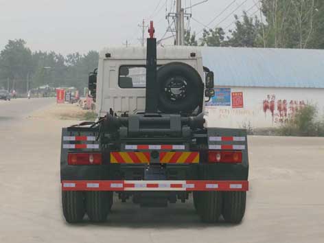 车厢可卸式垃圾车外形长宽高尺寸为8850,8450,8650,8250×2480×3190(mm),该车选用康机ISB210 50发动机,功率155kw,可达国五排放标准,车厢可卸式垃圾车整车型号为CLW5250ZXXE5,轴距为5350+1300mm,车厢可卸式垃圾车CLW5250ZXXE5底盘型号为东风牌EQ1250GLJ2底盘。