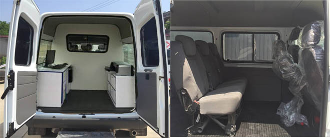 流动服务车采用原厂-底盘,该车辆轴距mm,流动服务车整车型号为CLW5040XDWJ5,配置江铃JX493ZLQ5发动机,功率85kw,排放标准达到国Ⅴ,流动服务车CLW5040XDWJ5外形长宽高尺寸为5696×1972×2240,2370(mm)。
