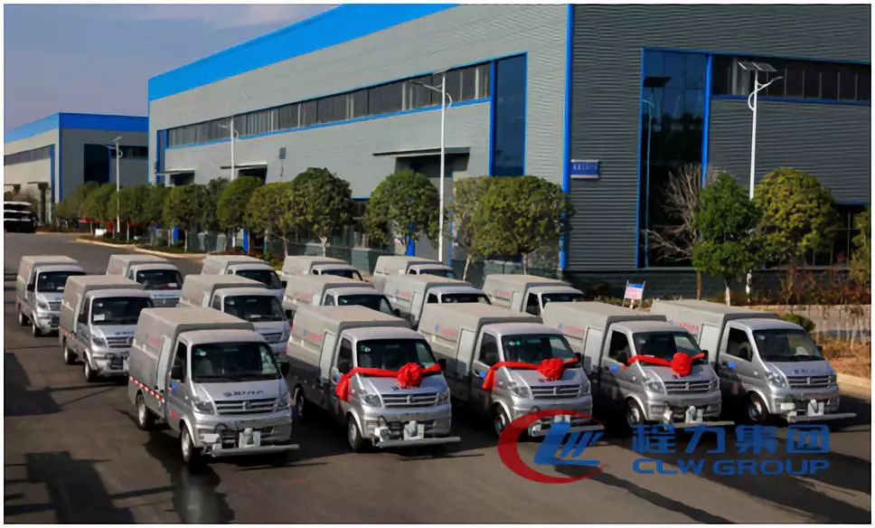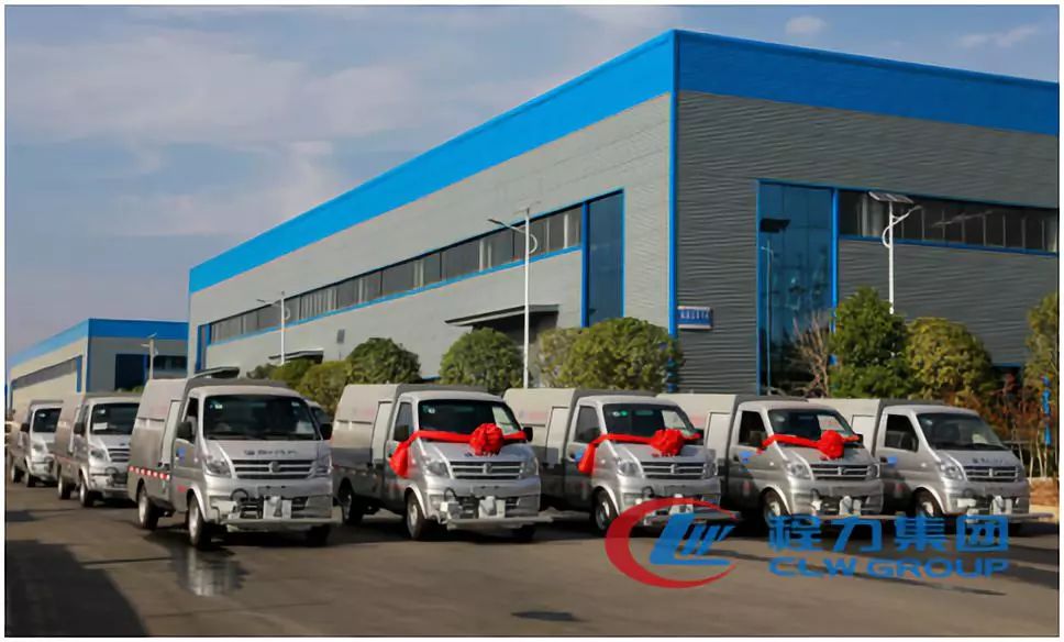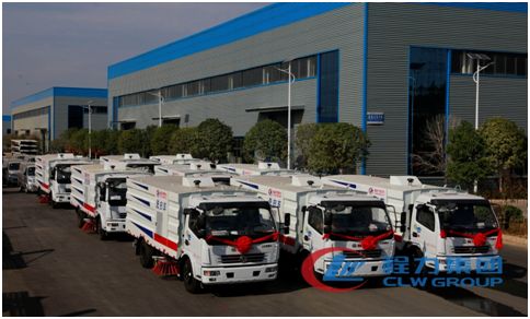 秋日的暖阳下,整齐排一的东风大多利卡洗扫车和人行道路面养护车熠熠生辉,威风凌凌的排列在气势宏伟的程力公司门口。