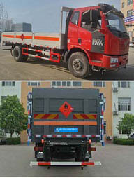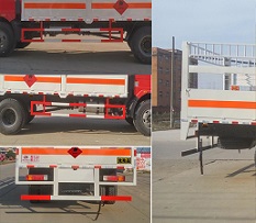 | 其他 | 该车适用于运输危险品,用于运输具有独立容器(瓶)包装的易燃气体(类项号:2.1):液化石油气,压缩甲烷或甲烷含量高的压缩天然气,乙炔,乙烷,丁烷,丙烯,丁烯,二甲醚,压缩氧。发动机CA4DK1-18E51,CA4DK1-22E51分别对应的油耗值为:27.42,27.42。当整车长度为8500mm时,轴距4700mm,5000mm,5300mm与后悬2400mm,2100mm,1800mm一一对应。当整车长度为8680mm时,轴距5600mm与后悬1680mm一一对应。侧防护和后防护装置材料材质为Q23碳钢,侧防护与箱体底部焊接连接,后防护装置与车架采用焊接连接。后防护截面尺寸(mm):145×40,离地高度为540mm。仅采用底盘子午线轮胎和带ABS的底盘,该车前轮安装盘式制动器,前置排气管,装配限速装置,限速79km/h。安装带有卫星定位功能的行驶记录仪。专用装置为固定用卡槽。ABS系统生产厂家:长春科密汽车制动有限公司,型号:CM4XL。选装无栅栏,选装后部液压尾板,货栏颜色可变化,文字喷涂位置可变化。后部液压尾板收起状态长度是250mm。 | ||
