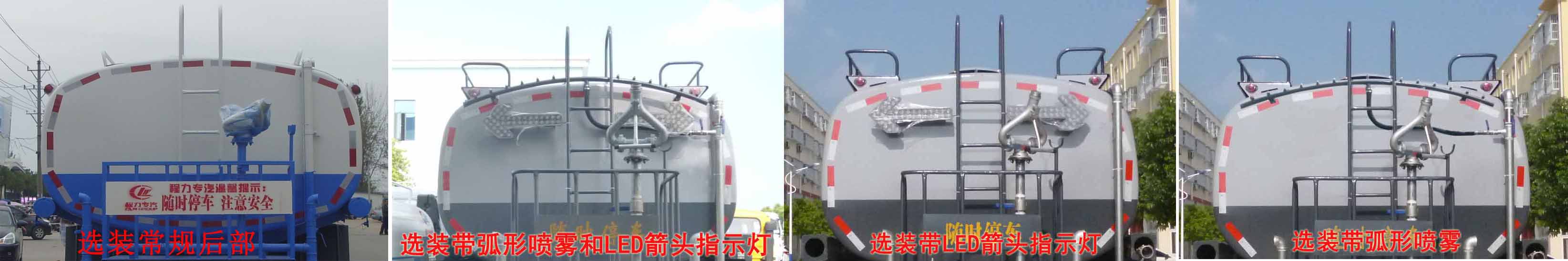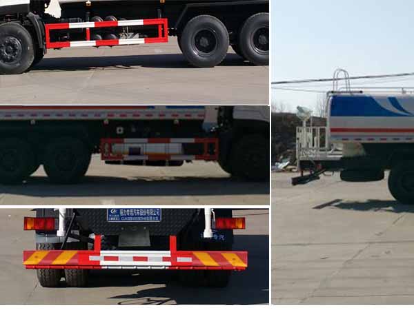| 其他 | 1,罐体有效容积13.54立方米,罐体外形尺寸(长×长轴×短轴 单位mm): 6500×2200×1400。2,防护材料:Q23碳钢,连接方式:左右侧面及后下部防护均采用焊接连接,后部防护断面尺寸(mm):150×50,后部防护离地高度(mm):500。3,ABS的型号为ABS-E 4S/4M,生产厂家为威伯科汽车控制系统(中国)有限公司。4,安装具有卫星定位功能的行驶记录仪。5,专用装置:罐体,主要用于洒水和园林绿化。6.仅选用4350+1300轴距底盘改装。7.可选装常规后部、选装带弧形喷雾及LED箭头指示灯、选装带LED箭头指示灯、选装带弧形喷雾。8、可选装气柜。9、可选装新款外观。 | ||