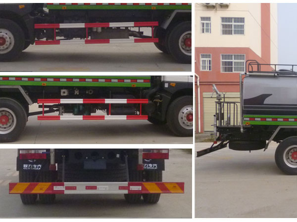 | 其他 | 1,罐体有效容积11.23立方米,整车长度(mm)/轴距(mm)/罐体外形尺寸(长×长轴×短轴)(mm)/整备质量(kg)/额定载质量(kg)的对应关系为:7630/3950/4300×2300×1650/6700/11100,8180/4500/4800×2300×1500/7100/10700。2,防护材料:Q235B碳钢,连接方式:左右侧面防护与副梁均采用螺栓连接,后下部防护与车架采用螺栓连接,后部防护断面尺寸(mm):150×50,后部防护离地高度(mm):500。3,安装具有卫星定位功能的行驶记录仪。4, ABS系统生产厂家,型号 :焦作博瑞克控制技术有限公司,J ABS。5,专用装置:罐体,主要用于路面洒水及园林绿化。6,该车可选装:A,后部带弧形喷雾和LED箭头指示灯;B,后部带LED箭头指示灯;C,后部带弧形喷雾装置。 | ||