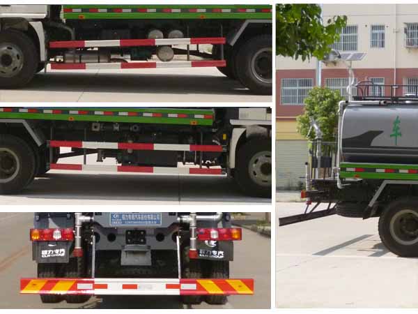 | 其他 | 1,仅选用4500mm和4700mm轴距底盘改装。2,罐体有效容积10.81立方米,该车整车长/轴距/罐体尺寸(罐体长×长轴×短轴)的对应关系为(mm): 8340/4700/5000×2300×1500;8140/4500/4800×2300×1500。2,防护材料:Q235B碳钢,连接方式:左右侧面及后下部防护均采用螺栓连接,后部防护断面尺寸(mm):150×50,后部防护离地高度(mm):500。3,ABS装置生产型号及厂家:西安正昌电子有限责任公司(型号:ZQFB-V)。4,专用装置:罐体,主要用于洒水和园林绿化。5.可选装A、后部带弧形喷雾和LED箭头指示灯,B、后部带LED箭头指示灯,C、后部带弧形喷雾装置。6.安装具有卫星定位功能的车辆行驶记录仪。 | ||