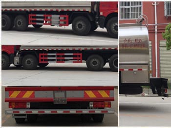 | 其他 | 该车型为非危化品运输车。罐体有效容积:17.66立方米;罐体外形尺寸(长/长轴/短轴)(mm):9000/2400/1600(罐体内部尺寸为8760×2160×1360),罐体保温层厚度为(mm):120。防护材料:Q23碳钢,连接方式:左右侧面及后部防护装置均采用焊接连接,后部防护断面尺寸(mm):100×50,后部防护离地高度(mm):515。随底盘选装平顶驾驶室。安装带有卫星定位功能的行驶记录仪。仅采用底盘轮胎型号(11.00R20 18PR,295/80R22.5 18PR,12R22.5 18PR)。ABS防抱死制动系统生产厂家,长春科密汽车制动有限公司,型号:CM4XL。油耗对应关系(L/100km):CA6DK1-28E5(40.7)。 | ||