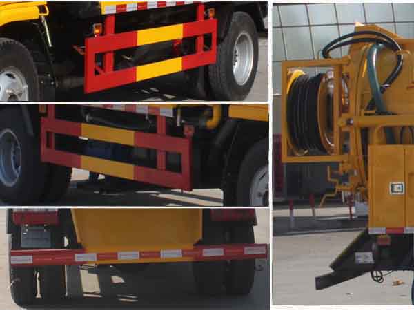 | 其他 | 水罐罐体有效容积:1.5立方米,运输介质: 水,密度:1000千克/立方米,罐体外形尺寸(长×直径)(mm):1500×1200。吸污罐罐体有效容积:1.74立方米,运输介质: 液态污物,密度:900千克/立方米,罐体外形尺寸(长×直径)(mm):1600×1200。水罐和吸污罐为两个独立罐体,清洗功能时用水罐, 吸污功能时用吸污罐,清洗吸污两种功能不同时使用,两罐不能同时满载。防护材料:Q23碳钢,连接方式:左右侧面及后下部防护均采用焊接连接,后部防护断面尺寸(mm):100×50,后部防护离地高度(mm):430。随底盘选装前面罩,前保险杠,前组合灯具.ABS厂家及型号:襄阳东风隆诚机械有限责任公司/ABS/ASR-24V-4S/4M.选装油箱左右侧安装位置.选装不同的外形图片. | ||