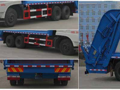压缩式垃圾车外形长宽高尺寸为10400,10200,10000×2500×3250(mm),该车选用玉柴YC6A240-50发动机,功率177kw,可达国五排放标准,压缩式垃圾车整车型号为CLW5251ZYSE5,轴距为5850+1350mm,压缩式垃圾车CLW5251ZYSE5底盘型号为东风牌EQ1258VFJ2底盘。
