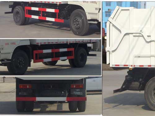 | 其他 | 1、防护材料:Q23碳钢,连接方式:左右侧面及后下部防护均采用焊接连接,后下部防护断面尺寸(mm):120×50,后下部防护离地高度(mm):430。2、该车长度/前悬/轴距对应关系为(mm):8420/1450/5100,8220/1250/5100,8020/1450/4700,7820/1250/4700,7820/1450/4500,7620/1250/4500,7270/1450/3950,7070/1250/3950;3、车辆颜色、文字喷涂及局部细节可变化。4、ABS型号:3631010-C2000,4460046440,生产厂家:东科克诺尔商用车制动系统(十堰)有限公司,威伯科汽车控制系统(中国)有限公司。5、随底盘选择驾驶室。6、采用发动机与油耗值对应关系为(L/100km):ISB170 50/23.8,ISB190 50/23.8,YC4E140-56/23.8,YC6JA180-50/23.8,CY4BK151/23.8,CY4SK151/23.8,YC4E160-56/23.8,YCD4J4S-150/23.8。7、选装车辆侧面及后部外观样式。8、专用装置:箱体,主要用于城镇环卫压缩站垃圾的转运。 | ||