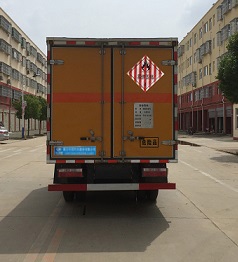 | 其他 | 该车适用于运输危险品为危险货物运输车。厢体顶部封闭,不可开启。选装右侧箱体不开门时的厢体宽度为2000mm,选装侧门型式及位置,选装厢体内部结构。整车长/轴距/后悬对应关系为(mm):5995/3360/1550,5995/3308/1602。仅采用底盘子午线轮胎和带ABS的底盘,该车前轮安装盘式制动器,前置排气管,装配限速装置,限速80km/h。安装带有卫星定位功能的行驶记录仪。安全装置为导静电带,用于防止静电。该车为危险货物运输车.用于运输具有独立容器(瓶)包装的锂,铝粉,锌粉,镁粉及镁合金粉,冰片,硫,磷,三硝基苯,含油废棉,鱼粉,磷化钠(锡),碳化钙(铝)等.运输介质类别和项别号:4.1,4.2,4.3。 侧防护和后防护装置材料材质为Q23碳钢,侧防护与厢体底部焊接连接,后防护装置与车架采用焊接连接。后防护截面尺寸(mm):100×50,离地高度为450mm。仅采用发动机型号HFC4DF1-2D2对应油耗值为 (L/100km):17.8。ABS控制器型号及生产企业:CM4XL-4S/4M,广州瑞立科密汽车电子股份有限公司。 | ||