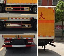 | 其他 | 该车适用于运输危险品为危险货物运输车。厢体顶部封闭,不可开启,随底盘选装驾驶室。选装右侧箱体不开门,选装侧门型式及位置,选装厢体内部结构。仅采用底盘子午线轮胎和带ABS的底盘,该车前轮安装盘式制动器,前置排气管,装配限速装置,限速80km/h。安装带有卫星定位功能的行驶记录仪。安全装置为导静电带,用于防止静电。该车为危险货物运输车.用于运输具有独立容器(瓶)包装的锂,铝粉,锌粉,镁粉及镁合金粉,冰片,硫,磷,三硝基苯,含油废棉,鱼粉,磷化钠(锡),碳化钙(铝)等.运输介质类别和项别号:4.1,4.2,4.3。侧防护和后防护装置材料材质为Q23碳钢,侧防护与厢体底部焊接连接,后防护装置与车架采用焊接连接。后防护截面尺寸(mm):100×50,离地高度为440mm。仅采用发动机型号4B2-115C50对应油耗值分别为油耗 (L/100km):12.61。ABS系统控制器型号是CM4XL-4S/4M,ABS系统控制器生产企业是广州科密汽车电子控制技术股份有限公司. | ||
