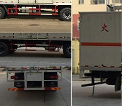| 其他 | 该车适用于运输危险货物为危险品运输车。厢体顶部封闭,不可开启。随底盘选装驾驶室,选装右侧箱体不开门,选装侧门型式及位置。仅采用底盘子午线轮胎和带ABS的底盘,该车前轮安装盘式制动器,前置排气管,装配限速装置,限速80km/h。安装带有卫星定位功能的行驶记录仪。安全装置为导静电带,用于防止静电。该车运输具有独立容器(瓶)包装的易燃气体:液化石油气,压缩天然气,乙炔,乙烷,丙烷,丁烷,异丁烷,丁烯,甲烷,丙烯,环丁烷,丙二烯,甲乙醚,打火机或打火机加油器(装有易燃气体),氢。运送危险品类项号为2.1。侧防护和后防护装置材料材质为Q23碳钢,侧防护与箱体底部焊接连接,后防护装置与车架采用焊接连接。后防护截面尺寸(mm):100×40,离地高度为530mm。仅采用发动机ISB210 50对应的油耗值为(L/100km):33.7。整车长/轴距/前悬/后悬对应关系为(mm):11000/5000+1800/1430/2770,11000/4100+1800/1430/3670,9800/3800+1800/1430/2770.ABS生产厂家:东科克诺尔商用车制动系统(十堰)有限公司;型号:3631010-C2000. | ||