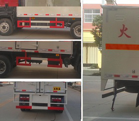 | 其他 | 该车适用于运输危险品。顶部不可开启,选装右侧箱体不开门,选装侧门型式及位置,选装后部液压尾板,后部液压尾板收起状态长度是250mm。选装同系列排半驾驶室和导流罩,选装厢体内部结构。当整车长度为6960mm时,轴距4100mm、3800mm与后悬1660mm、1960mm一一对应.当整车长度为5995mm时,轴距3300mm与后悬1495mm对应.该车运输具有独立容器包装的易燃气体:液化石油气、压缩天然气、乙炔、乙烷、丙烷、丁烷、异丁烷、丁烯、甲烷、丙烯、环丁烷、丙二烯、甲乙醚、打火机或打火机加油器(装有易燃气体)、氢,运送危险品类项号为2.1;运输具有独立容器包装的非易燃气体:液化气体(非易燃、充有氮、空气)、氧(氮、空气、氦、氩、氖)、二氧化碳、二甲基丙烷;运送危险品类项号为2.2.安装限速装置,限速79km/h。该车安装带有卫星定位功能的行驶记录仪。仅采用前盘制动器和安装ABS以及前置排气管的底盘。仅采用子午线轮胎。侧防护、后防护与车辆均采用焊接连接,材料均为:Q23,后防护断面尺寸(mm):120×50, 离地高度:400 mm.发动机ISF3.8s5154,YNF40E2,WP3Q130E50,D25TCIE3分别对应的油耗值为:18.29,18.03,18.20,18.3。ABS系统生产厂家:西安正昌电子有限责任公司,型号:ZQFB-V。 | ||