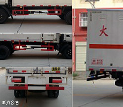 | 其他 | 该车适用于运输危险品。厢体顶部封闭,不可开启。选装右侧箱体不开门。选装不开侧门时整车宽度为2100mm。选装侧门型式及位置。仅采用底盘子午线轮胎和带ABS的底盘,该车前轮安装盘式制动器,前置排气管,装配限速装置,限速80km/h。安装带有卫星定位功能的行驶记录仪。安全装置为导静电带,用于防止静电。该车运输具有独立容器(瓶)包装的易燃气体:液化石油气,压缩天然气,乙炔,乙烷,丙烷,丁烷,异丁烷,丁烯,甲烷,丙烯,环丁烷,丙二烯,甲乙醚,打火机或打火机加油器(装有易燃气体),氢。运送危险品类项号为2.1。侧防护和后防护装置材料材质为Q23碳钢,侧防护与箱体底部焊接连接,后防护装置与车架采用焊接连接。后防护截面尺寸(mm):120×50,离地高度为490mm。仅选用发动机YN33CRE1对应的油耗值为(L/100km):18.49。ABS型号: XN-3550601;ABS生产厂家: 济南鑫宁汽车配件有限公司。 | ||