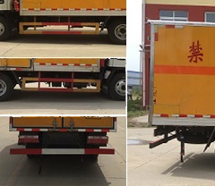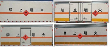 | 其他 | 该车适用于运输危险品。厢体顶部封闭,不可开启。选装右侧箱体不开门,选装侧门型式及位置。选装右侧箱体不开门时的厢体宽度为2000mm,选装厢体内部结构。整车长/轴距/后悬对应关系为(mm):5995/3360/1550,5995/3308/1602。仅采用底盘子午线轮胎和带ABS的底盘,该车前轮安装盘式制动器,前置排气管,装配限速装置限速80km/h。安装带有卫星定位功能的行驶记录仪。安全装置为导静电带,用于防止静电。该车运输具有独立容器(瓶)包装的易燃气体:液化石油气、压缩天然气、乙炔、乙烷、丙烷、丁烷、异丁烷、丁烯、甲烷、丙烯、环丁烷、丙二烯、甲乙醚、打火机或打火机加油器(装有易燃气体)、氢。运送危险品类项号为2.1。侧防护和后防护装置材料材质为Q23碳钢,侧防护与厢体底部焊接连接,后防护装置与车架采用焊接连接。后防护截面尺寸(mm):100×50,离地高度为450mm。仅采用发动机型号HFC4DF1-2D2对应油耗值为 (L/100km):17.8。ABS控制器型号及生产企业:CM4XL-4S/4M,广州瑞立科密汽车电子股份有限公司。 | ||