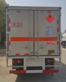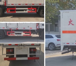 | 其他 | 该车适用于运输危险品。随底盘选装驾驶室。选装右侧箱体不开门,选装侧门型式及位置,选装厢体内部照片。选装不带侧开门对应的宽度为1950mm。厢体顶部封闭,不可开启。仅采用底盘子午线轮胎和带ABS的底盘,该车前轮安装盘式制动器,前置排气管,装配限速装置,限速80km/h。安装带有卫星定位功能的行驶记录仪。安全装置为导静电带,用于防止静电。ABS系统型号:APG3550500A,ABS系统生产厂家:浙江亚太机电股份有限公司。该车运输具有独立容器包装的易燃气体:液化石油气、压缩天然气、乙炔、乙烷、丙烷、丁烷、异丁烷、丁烯、甲烷、丙烯、环丁烷、丙二烯、甲乙醚、打火机或打火机加油器(装有易燃气体)、氢。运送危险品类项号为2.1。侧防护和后防护装置材料材质为Q23碳钢,侧防护与箱体底部焊接连接,后防护装置与车架采用焊接连接。后防护截面尺寸(mm):100×60,离地高度为450mm。发动机JX493ZLQ5,JX493ZLQ对应的油耗值分别为:11.9,10.8。 | ||