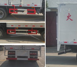 | 其他 | 该车适用于运输危险品为危险物品厢式运输车。选装同系列排半驾驶室和导流罩,选装厢体内部结构.厢体顶部封闭,不可开启。该车主要用于运输独立容器包装的介质:粘合剂,涂料,料溶液,煤油,机油,苯,甲醇,乙醇,丙酮,甲苯,二甲苯,油漆,类项号:3.。当整车长度为6960mm时,轴距4100mm、3800mm与后悬1660mm、1960mm一一对应.当整车长度为5995mm时,轴距3300mm与后悬1495mm对应.侧防护、后防护与车辆均采用焊接连接,材料均为:Q23,后防护断面尺寸(mm):120×50, 离地高度:400 mm.发动机ISF3.8s5154,YNF40E2,WP3Q130E50,D25TCIE3分别对应的油耗值为:18.29,18.03,18.20,18.3。仅采用底盘子午线轮胎和带ABS的底盘,该车前轮安装盘式制动器,前置排气管,装配限速装置,限速79km/h。安装带有卫星定位功能的行驶记录仪。ABS系统生产厂家:西安正昌电子有限责任公司,型号:ZQFB-V.选装侧门型式及位置,选装后部液压尾板,后部液压尾板收起状态长度是250mm。 | ||