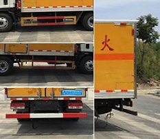 | 其他 | 该车适用于运输危险品。厢体顶部封闭,不可开启,选装右侧箱体不开门,选装侧门型式及位置,随底盘选装驾驶室。选装厢体内部结构。仅采用底盘子午线轮胎和带ABS的底盘,该车前轮安装盘式制动器,前置排气管,装配限速装置,限速80km/h。安装带有卫星定位功能的行驶记录仪。安全装置为导静电带,用于防止静电。该车主要用于运输独立容器包装的介质:粘合剂,涂料,料溶液,油漆,机油,废机油,苯,甲醇,乙醇,丙酮,甲苯,二甲苯,类项号:3。侧防护和后防护装置材料材质为Q23碳钢,侧防护与箱体底部焊接连接,后防护装置与车架采用焊接连接。后防护截面尺寸(mm):100×50,离地高度为440mm。仅采用发动机型号4B2-115C50对应油耗值分别为油耗 (L/100km):12.61。ABS系统控制器型号是CM4XL-4S/4M,ABS系统控制器生产企业是广州科密汽车电子控制技术股份有限公司。 | ||