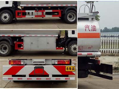 | 其他 | 该车适用于危险品运输。运输介质:柴油,汽油,煤油,类项号:3,罐体有效容积:8.2立方米。罐体外形尺寸(长×长轴×短轴)(mm):4700×1750×1250。防护材料:Q23碳钢,连接方式:左右侧面及后部防护均采用焊接连接,断面尺寸(mm):120×50,后部防护离地高度(mm):360。.随底盘选装驾驶室,选装不同的后部灯具。仅采用底盘子午线轮胎和带ABS的底盘,该车前轮安装盘式制动器,前置排气管,装配限速装置,限速80km/h。安装带有卫星定位功能的行驶记录仪。.ABS生产厂家/型号:上海万捷汽车控制系统有限公司/VIE ABS-II。仅采用发动机型号与油耗值对应关系(L/100km):WP3.7Q130E50(23.68),CA4DC3-12E5(23.6),WP4.1Q160E50(24.69),CA4DH1-16E5-30(24.59),CA4DD1-15E5(23.38),WP3.7Q140E50(23.68)。危险货物运输车辆的类型(FL型车辆)。 | ||