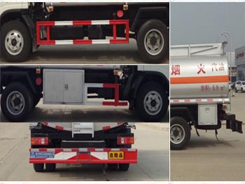 | 其他 | 该车适用于危险品运输。运输介质:汽油,类项号:3,罐体有效容积:5.9立方米。罐体外形尺寸(长×长轴×短轴)(mm):①3100(实际长4000,其中罐体前部900mm长用于安装加油机用)×1900×1300;②(选装加油机下置时)3900×1850×1200。可装配加油机型号及生产企业:BL1111Z/珠海市贝林加油设备有限公司中山分公司,HS1812B/托肯恒山科技(广州)有限公司,SKES-1112/恒和嘉华科技有限公司,SKDS-2001A/上海伯莱机械有限公司,SK20QF-111A,SK20QF-222A/郑州三金石油设备制造有限公司,CS20D1110F/正星科技有限公司,JSK-70B1121CZ,JSK-70B1121C,JSK45B1121C/稳恩佳力佳(北京)石油化工设备有限公司,HT-YV60E/随州市华特专用设备有限公司,XTST121BF1/邢台正润通科技发展有限公司。防护材料:Q23碳钢,连接方式:左右侧面及后下部防护均采用焊接连接,后部防护断面尺寸(mm):260×50,后部防护离地高度(mm):410。仅采用底盘子午线轮胎和带ABS的底盘,该车前轮安装盘式制动器,前置排气管,装配限速装置,限速80km/h。安装带有卫星定位功能的行驶记录仪。ABS系统生产厂家:东风电子科技股份有限公司汽车制动系统公司,型号:DETC-ABS-4S/4M。危险货物运输车辆的类型(FL型车辆)。 | ||
