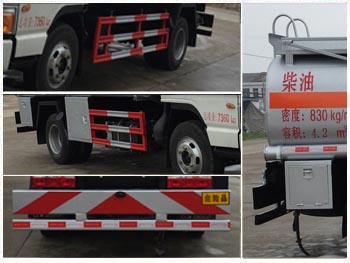 | 其他 | 1、该车适用于危险品运输,运输介质:柴油,汽油,煤油,介质密度分别为:0.83吨/立方米, 0.73吨/立方米, 0.80吨/立方米; 类项号:3,罐体有效容积:4.2立方米。罐体外形尺寸(长×长轴×短轴)(mm):①3100(实际长4000,其中罐体前部900mm长用于安装加油机用)×1750×1150;②(选装加油机下置时)3800×1600×1030。2、防护材料:Q23碳钢,连接方式:左右侧面及后下部防护均采用焊接连接,后部防护断面尺寸(mm):100×50,后部防护离地高度(mm):390。3、该车可装配:恒和嘉华牌 ,伯莱牌,正星牌,恒山牌,华特牌,正润通牌税控加油机,其型号对应为: SKES-1112,SKDS-2001A,SC20D1110F,HS1812B,HT-YV60E,XTST121BF1对应生产厂家为:恒和嘉华科技有限公司 ,上海伯莱机械有限公司,正星科技有限公司,托肯恒山科技(广州)有限公司,随州市华特专用设备有限公司,邢台正润通科技发展有限公司。4、仅采用底盘子午线轮胎和带ABS的底盘; 该车前轮安装盘式制动器,前置排气管,装配限速装置,限速80km/h。安装带有卫星定位功能的行驶记录仪。ABS系统型号/生产企业对应关系:CM4XL-4S/4M/广州科密汽车电子控制技术股份有限公司。5、车辆颜色可选,文字喷涂位置可变化;选装不带走台。 | ||
