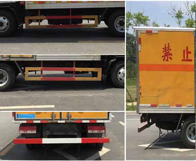 | 其他 | 厢体顶部封闭,不可开启;该车为危险物品运输车用于运输具有独立容器包装的毒性气体气瓶(罐):液氯,液氨,四氟化硅,类项号:2.3;防护材料:Q23碳钢,连接方式:左右侧面及后下部防护均采用焊接连接,后部防护断面尺寸(mm):100×50,后部防护离地高度(mm):440.仅采用底盘子午线轮胎和带ABS的底盘,该车前轮安装盘式制动器,前置排气管,装配限速装置,限速80km/h.安装带有卫星定位功能的行驶记录仪。ABS系统控制方式是4S/4M,ABS系统控制器型号是CM4XL-4S/4M,ABS系统控制器生产企业是广州科密汽车电子控制技术股份有限公司.随底盘选装驾驶室外观;仅采用发动机型号4B2-115C50对应油耗值为 (L/100km):12.61. | ||
